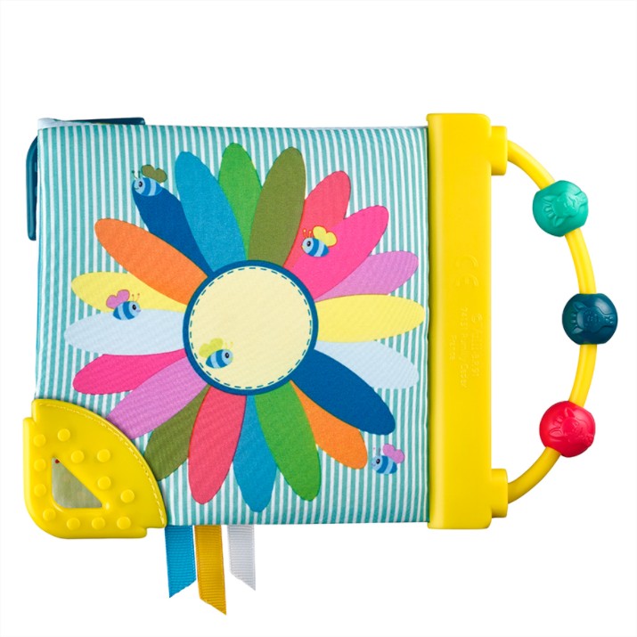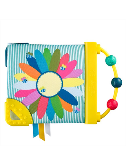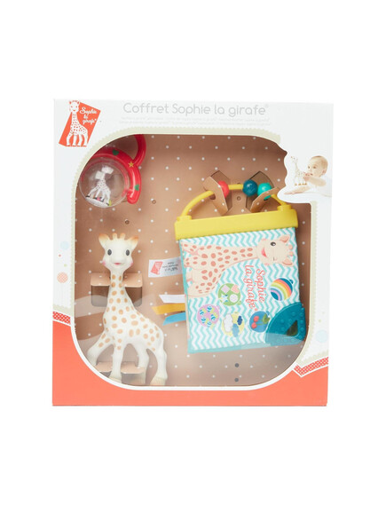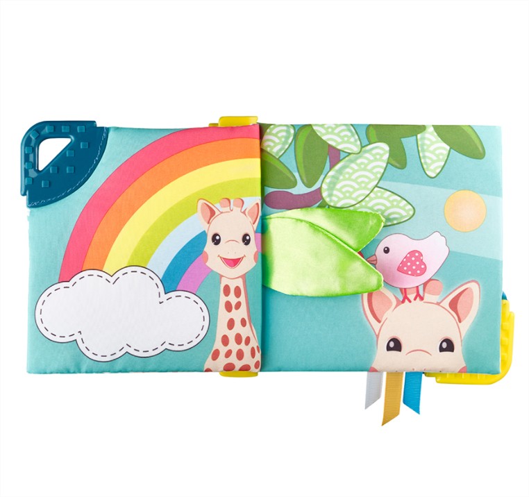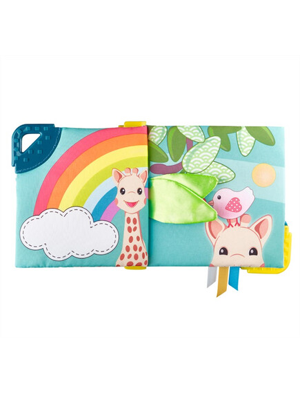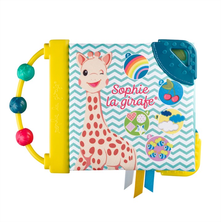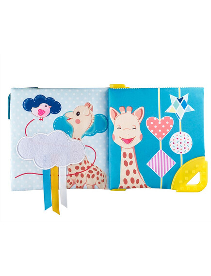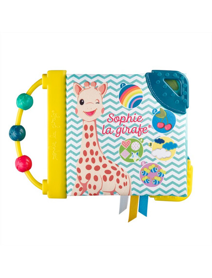 - Книжка, пълна с дейности, които ще събудят всички сетива на бебето! Бебето ще разпознае жирафа Софи и ще се забавлява, като брои елементите на всяка страница „1 дъга, 2 череши, 3 мехурчета и т.н.“.То ще открие много дейности: дръжка сметало и 3 мъниста за движение, пищялка, скрита на предната страница, различни материали за изследване, ярки и контрастни цветове, 2 меки места за дъвчене и успокояване на възпалените венци.