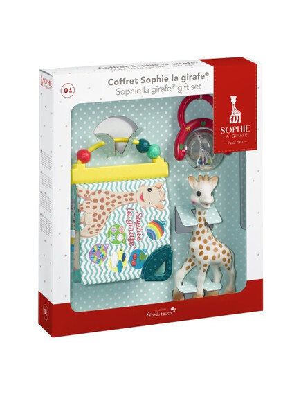 - Известното жирафче Софи, изработено от естествен каучук и натурални оцветители, съпътстващ подарък за всички бебета през последните 50 години! Идеално за игра, облекчаване на никнещите зъбки, меко на допир и издаващо звуци!