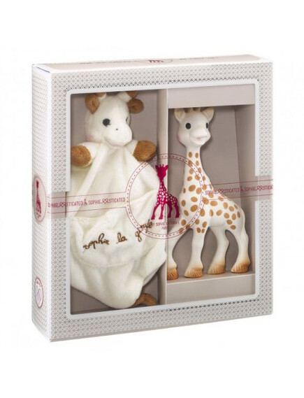 Този красив подаръчен комплект включва нашата любима Софи, създадена от 100% естествен каучук и напълно безопасна за гризане и утешител-одеялце за гушкане и гризкане. Утешителят има джоб, в който може да държите биберон и велкро лепенка, с която да закачите биберона.Бебето ви, ще се влюби и в двата продукта.