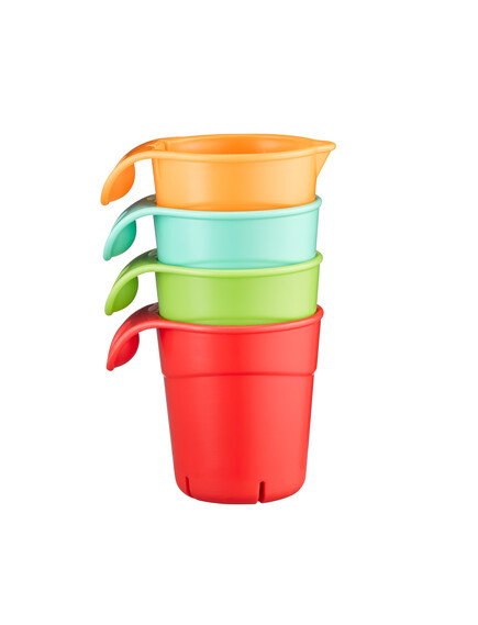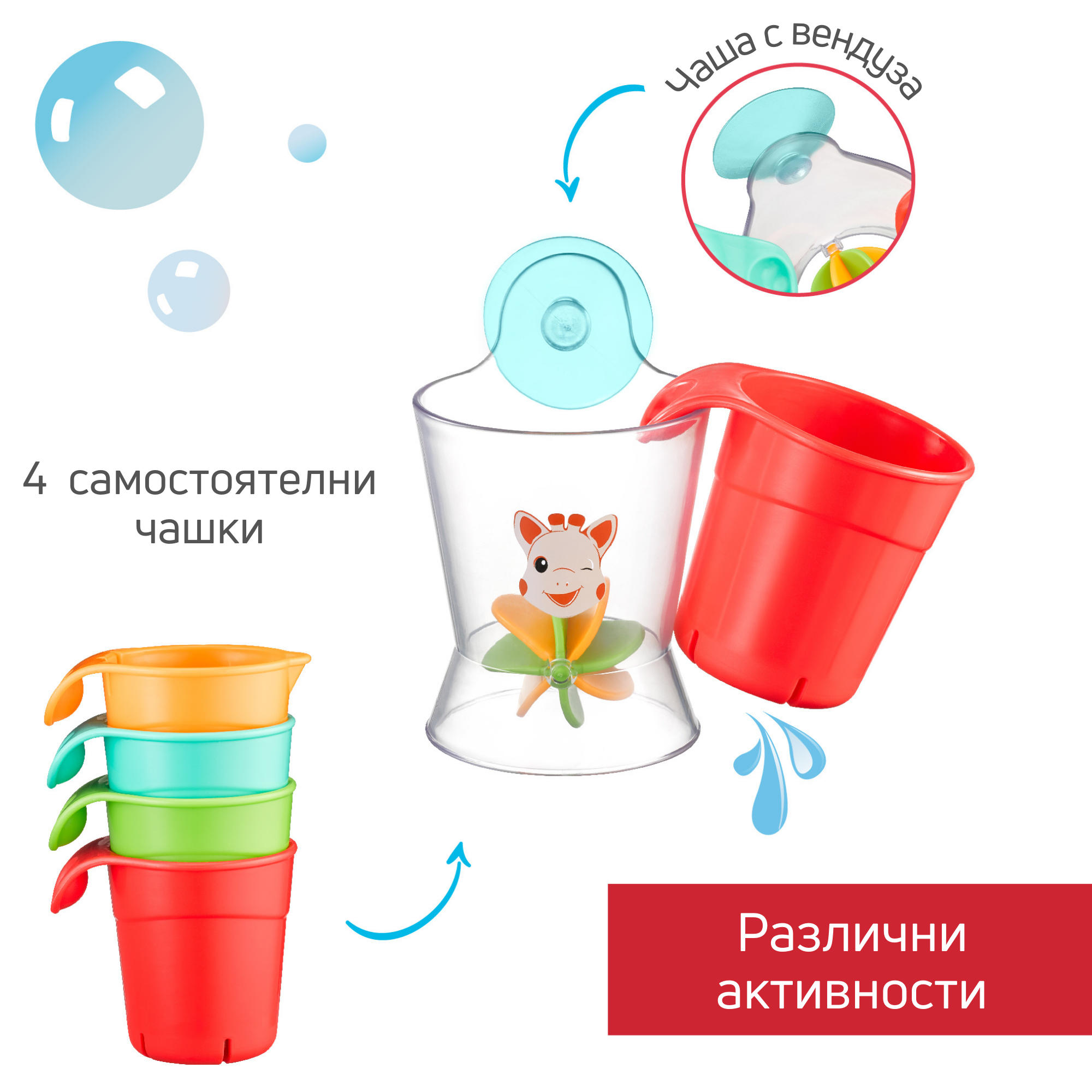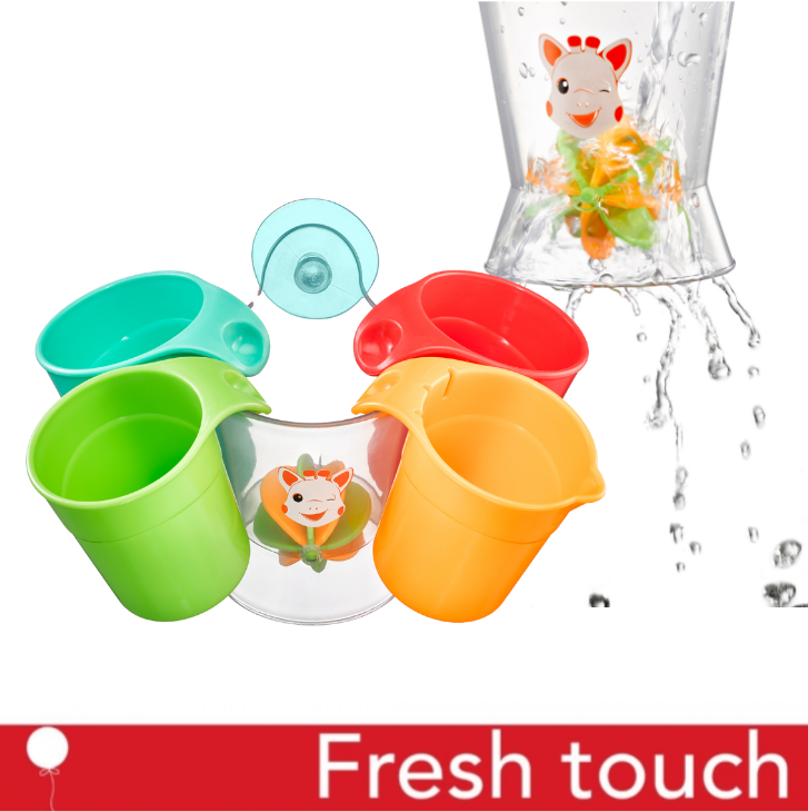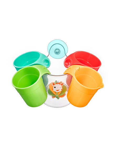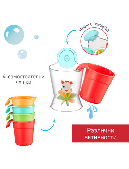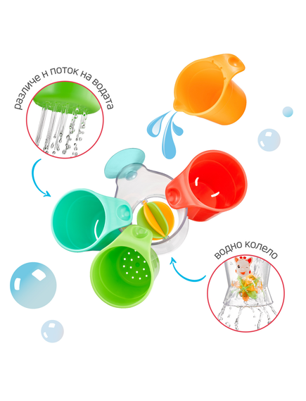 Още от първото си къпане бебето може да си играе с чашите и да налива водата в колелото, за да стимулирате любопитството му и да разбере причинно-следствената връзка .