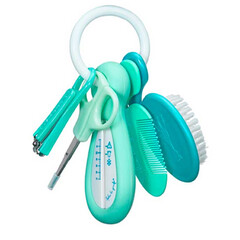 Всичко необходимо за грижата и хигиената на вашето бебе, събрано и винаги под ръка от жирафчето Софи  Комплектът включва: Мека четка Гребен Ножичка Термометър за баня Нокторезачка за деца Всичко това, в пръстен, който се отваря и затваря, така че да имате...