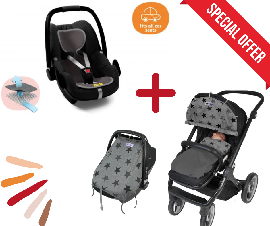 Два задължителни продукта за лятото идват да ви зарадват в едно страхотно комбо! Универсален сенник на Dooky Original в BestSeller гамата - Grey Starts и Aeromoov Air Layer подложка против изпотяване за столче за кола Група 0 (0-13кг) в цвят Антрацид