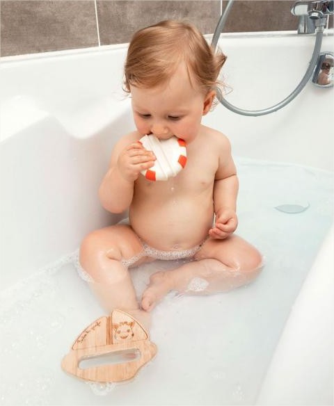 Спасителната лодка на Софи е дъвчаща, с различни текстури, рингът може да се извади от нея и да облекчи възпалените венци на бебето. То е абсолютно здраво и водата не може да мине през него.