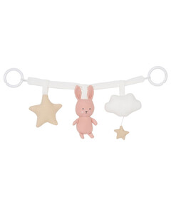 Красива висяща играчка с зайчета! Закачете я на количката или бебешкото кенгуру и вашето бебе ще се забавлява, докато прекарва времето си щастливо. Подходяща от новородено. Състав: памук и полиестер Дължина: 49 см