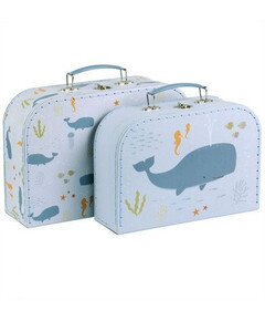 Прекрасен комплект от два куфара за декорация, игра или съхранение!   Куфарите се предлагат в два различни размера и са изработени от здрав картон с полиестерни шевове. И големият, и малкият куфар са с цветна метална дръжка и закопчалка, която ще пази всички...