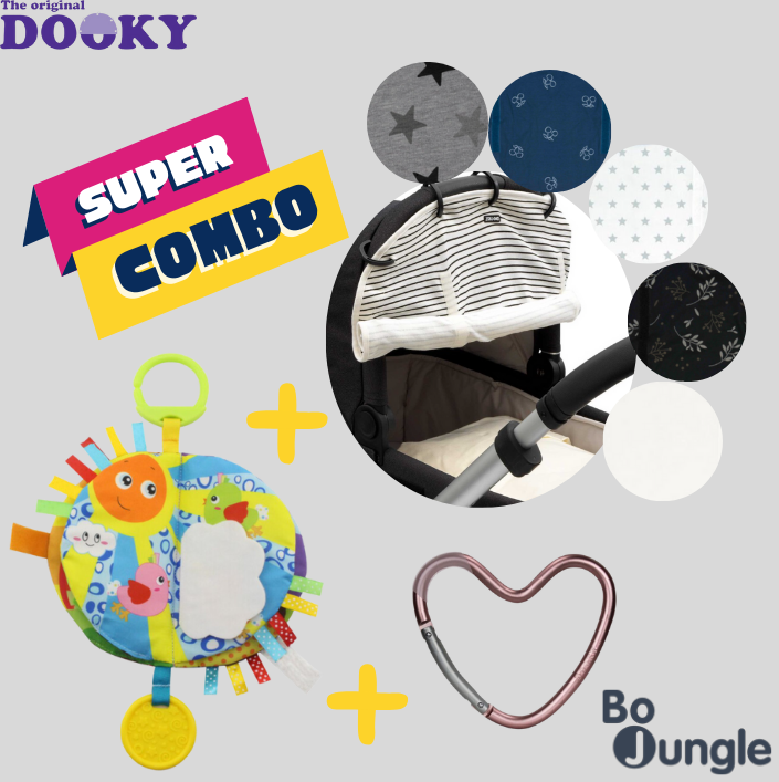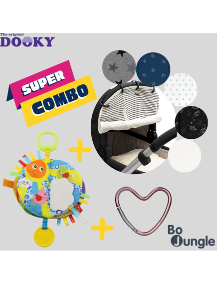 Super Combo : Dooky Original: Сенник с UPF50 + с цвят по избор + Dooky Кукa за количка Pink Heart + Bo Jungle: Мека цветна книжка
