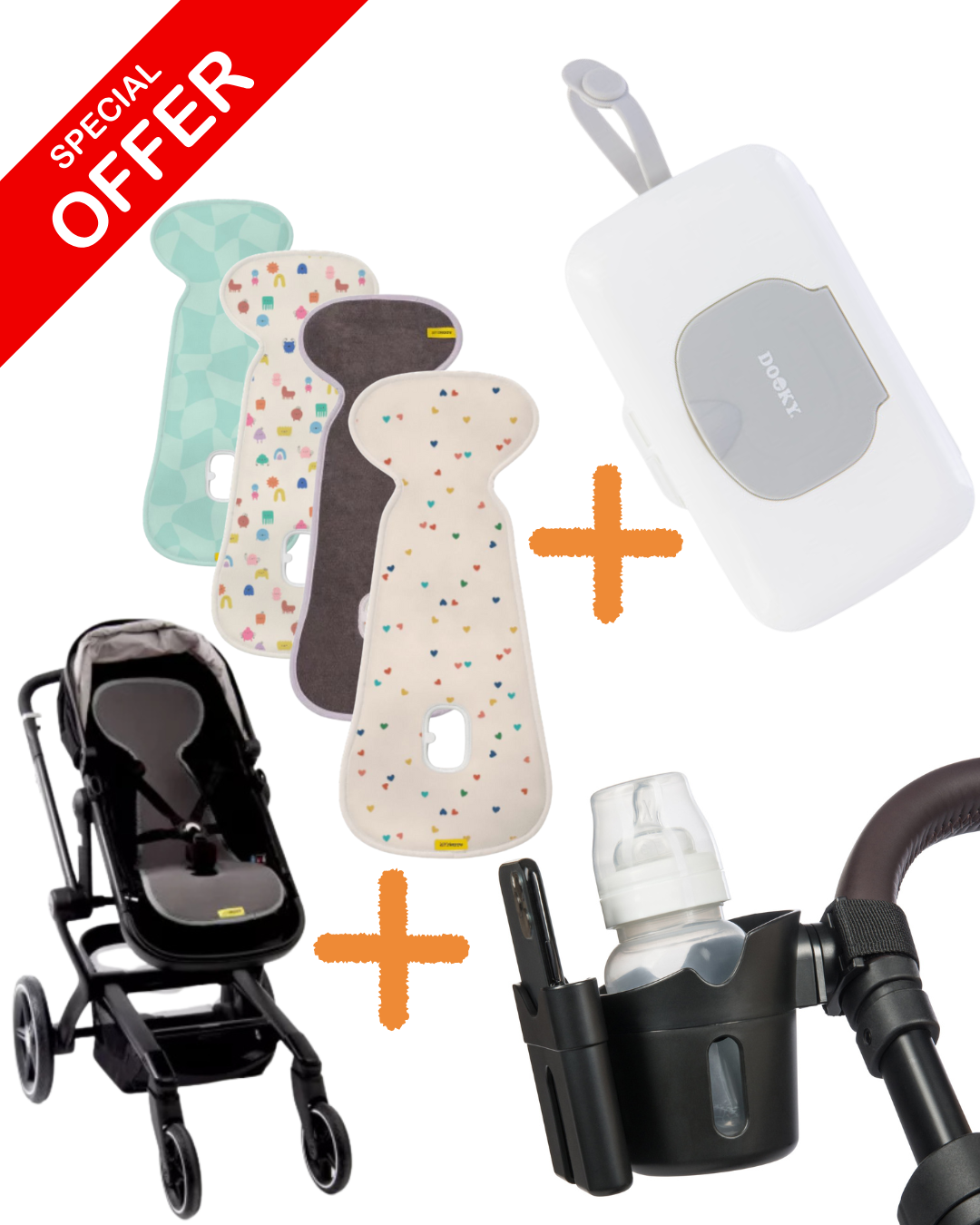 Включва оригиналните подложки против изпотяване Aeromoov Air Layer, кутия за съхранение на мокри кърпички и 2в1 Поставка за чаша и телефон!