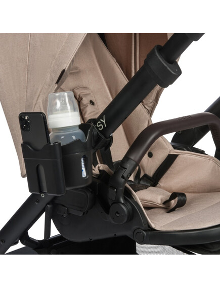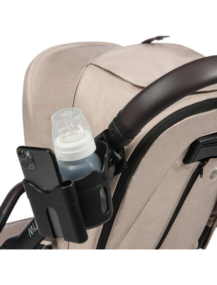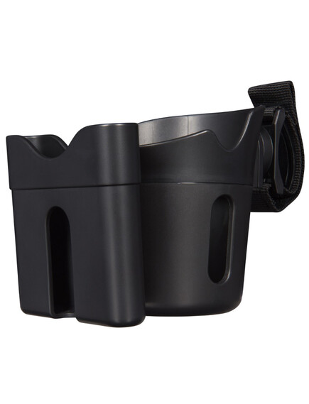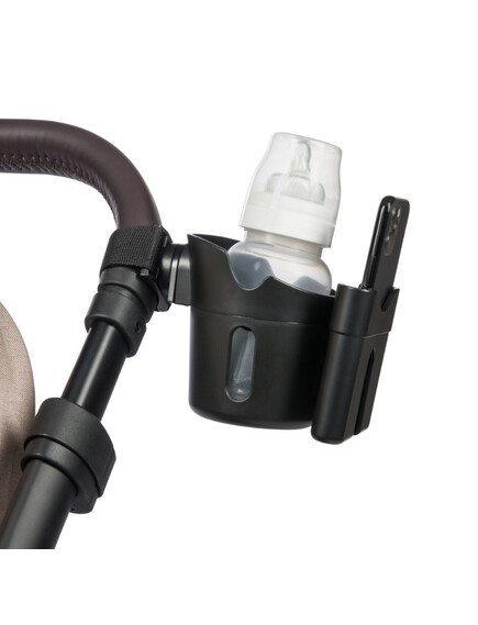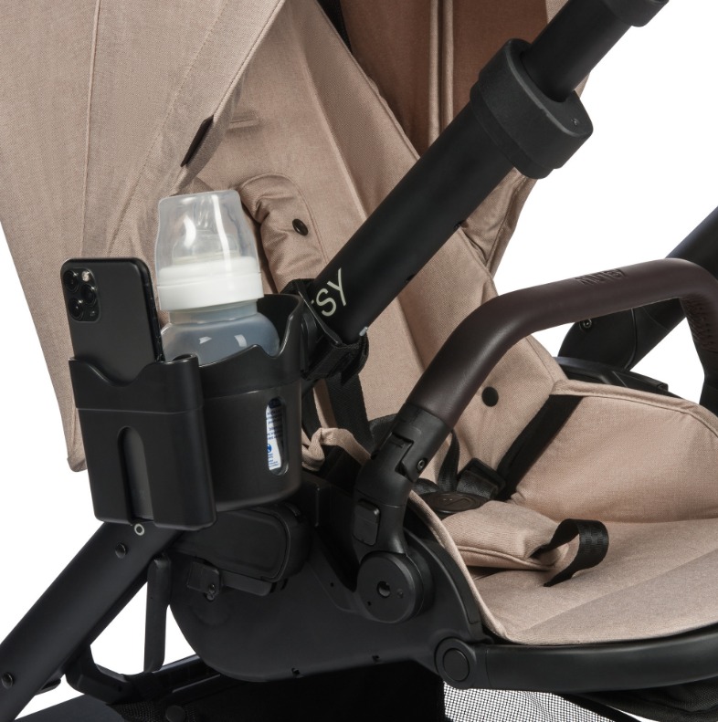 Практичен аксесоар за вашата количка, който съчетава поставката за вашия мобилен телефон с поставка за чаша или бебешката бутилка!