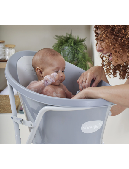 Сгъваемата стойка Shnuggle идеално допълва ваната Shnuggle! Тя повдига Вашето бебе на около 76 см от пода до кръста ви. По този начин не се навеждате и улеснявате самостоятелното къпане, без причинена болка в гърба след това.