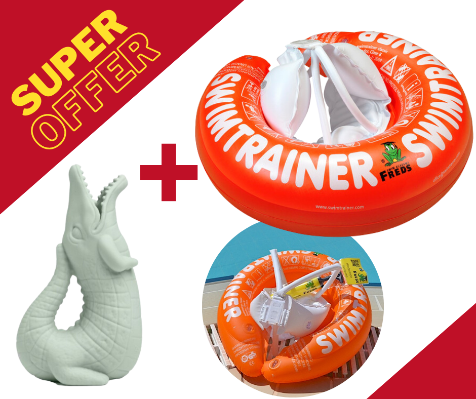 Офертата включва : Пояс Swimtrainer с размер по избор + Scrunch Рециклируема силконова лейка във формата на крокодил -цвят Sage Green