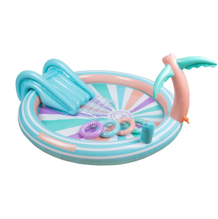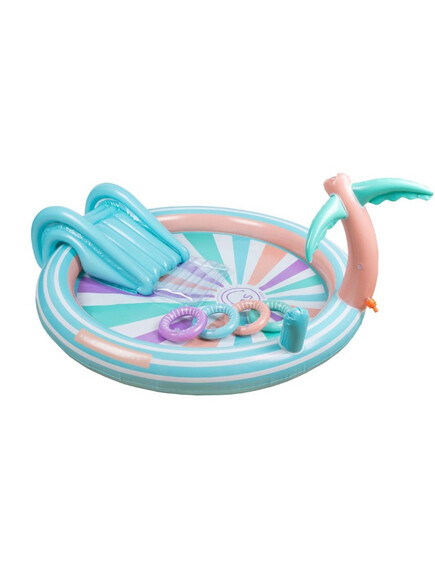 Включва пързалка, много подскачащи играчки и пръскачка, която може да се прикрепи към градинския маркуч.