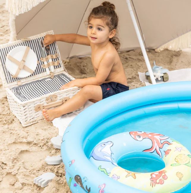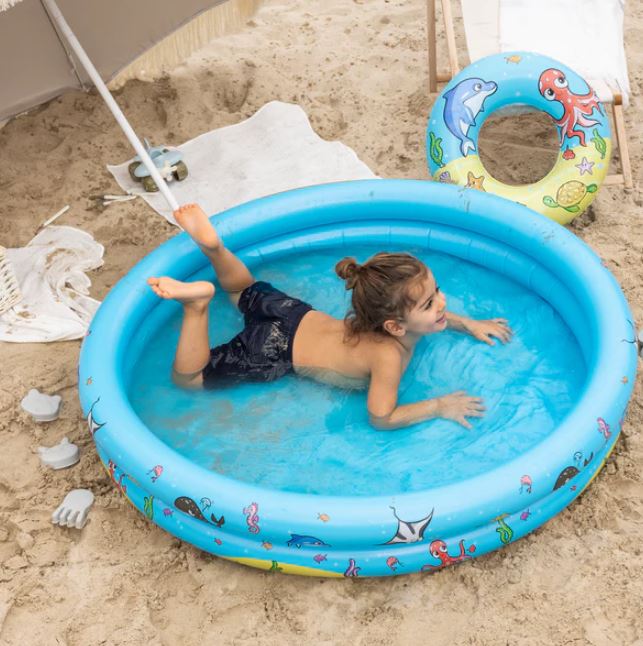 Издръжлив и много впечатляващ, той ще ви даде прохлада в горещите летни дни и безкрайно забавление на плажа, басейна, градината или дори балкона! Със своите допълнителни аксесоари (топка и пояс) в същият десен забавленията са гарантирани.