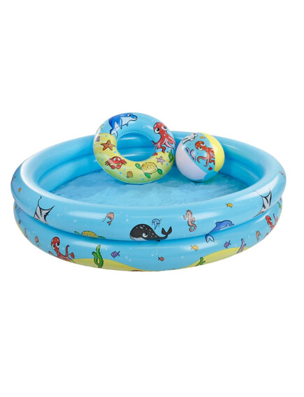 Комплектът съдържа - 1 бр. басейн, 1 бр. надуваем пояс, 1 бр. надуваема топка