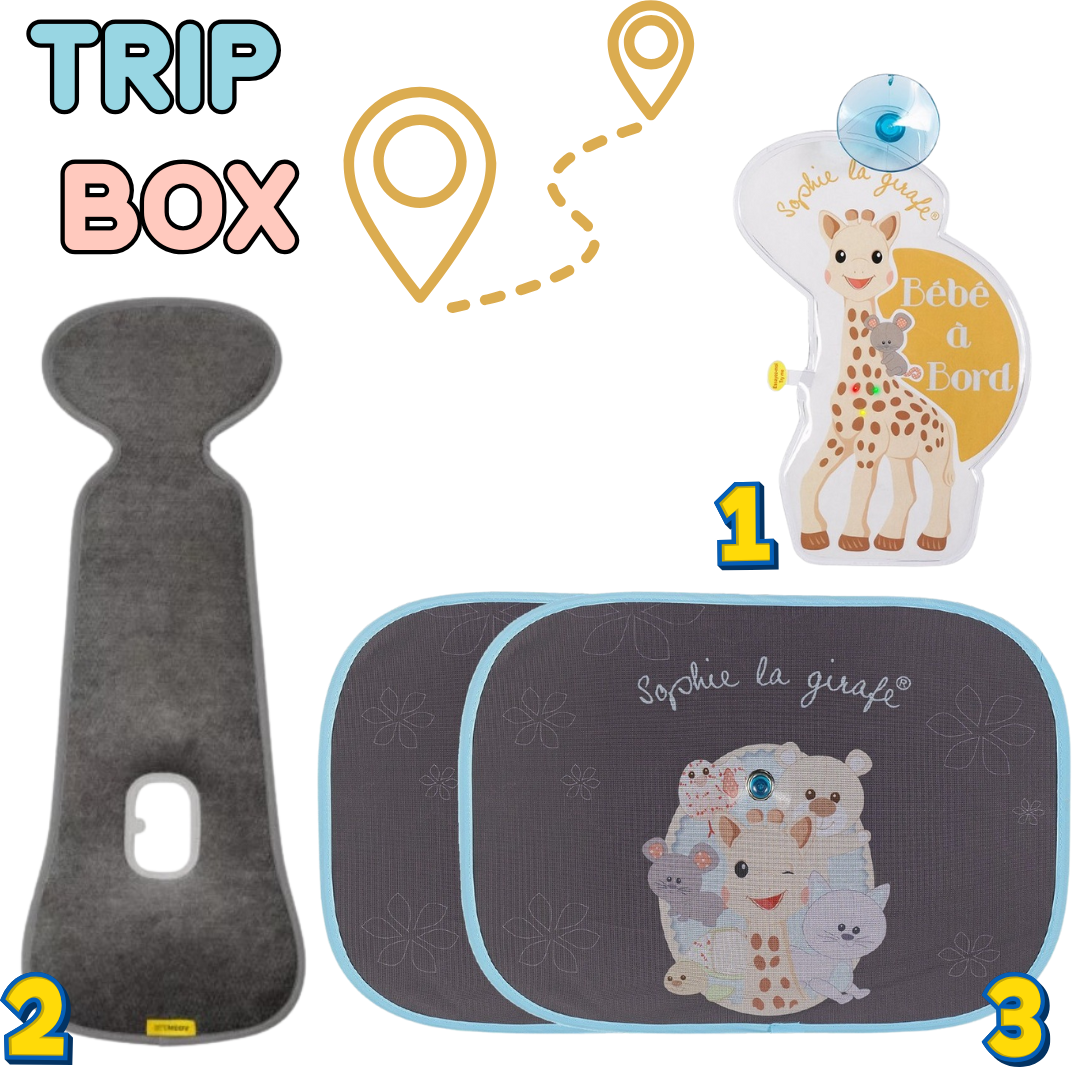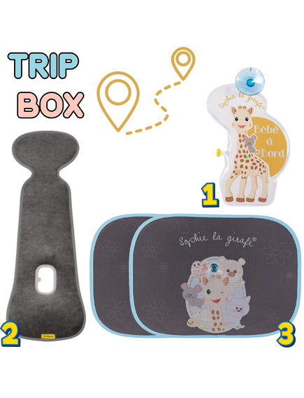 Trip BOX: Жирафчето Софи - Сенници за кола и Светещ знак "Baby on board"(бебе в колата) + Air Layer - Група 1 Подложки против изпотяване за столче за кола (9-18кг) и някои видове колички - Антрацид