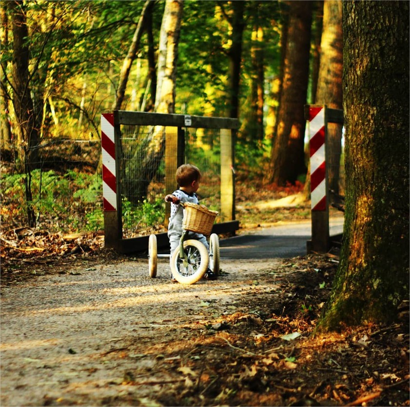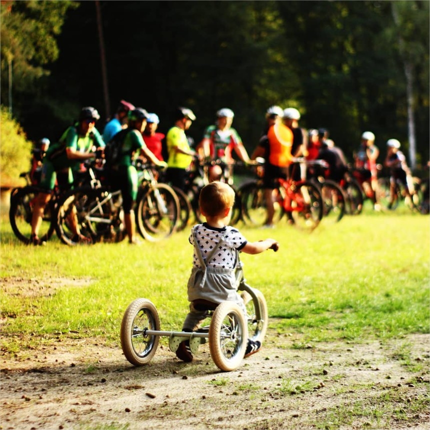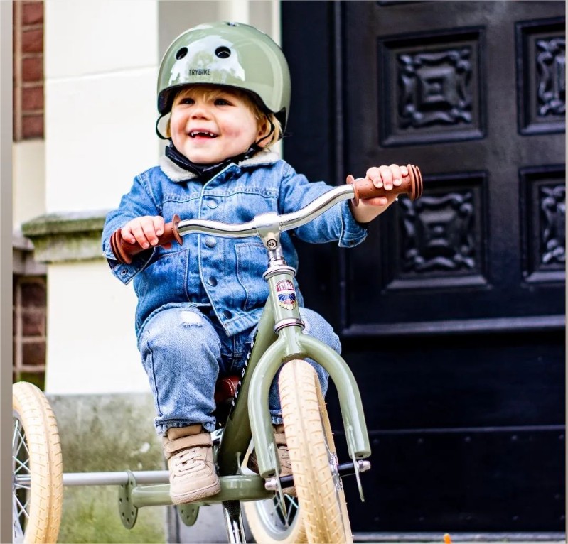 Така в началото, когато детето е на около една годинка, то ще започне обучението си с триколка, която ще му помогне да овладее седналото положение, контролирането на кормилото в права позиция и да упрвлява велосипеда, отблъсквайки го с краката си.