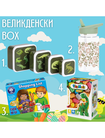 Великденски BOX: A little lovely company: Сет от 4 кутии за храна - Крокодилче + Orchard Toys: Списък за пазаруване + Playmais: Крафт игра за моделиране - Да си направим Динозавър + A little lovely company: Бутилка за вода от Тритан 450 мл - по избор
