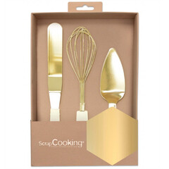 Идеална кутия с  3 инструмента за сладкиши , които всеки сладкар би искал да има! Отличават се със златист блестящ цвят! Чудесен  подарък, както е в кутията си!  Кутията включва: 1 телена бъркалка от неръждаема стомана с пластмасова дръжка с...