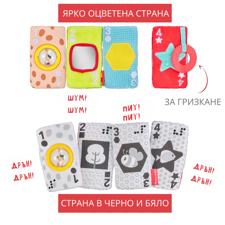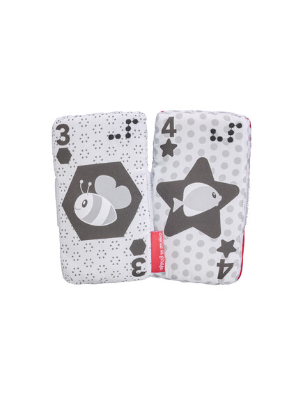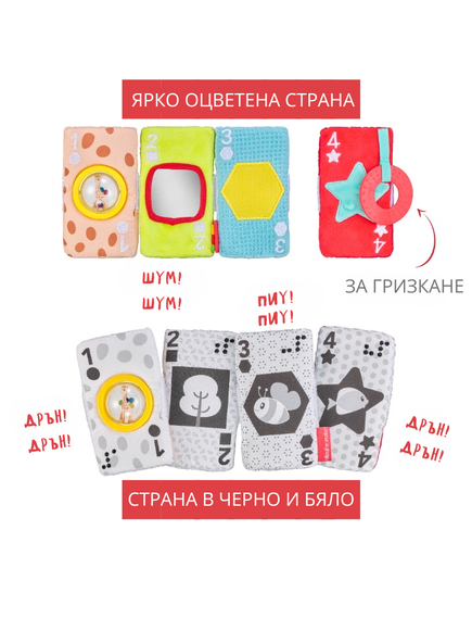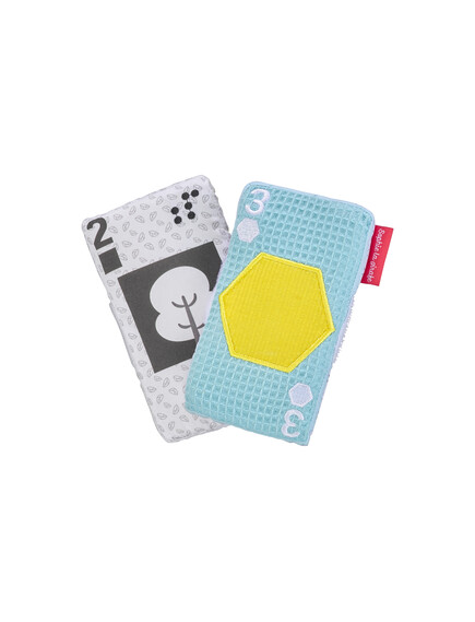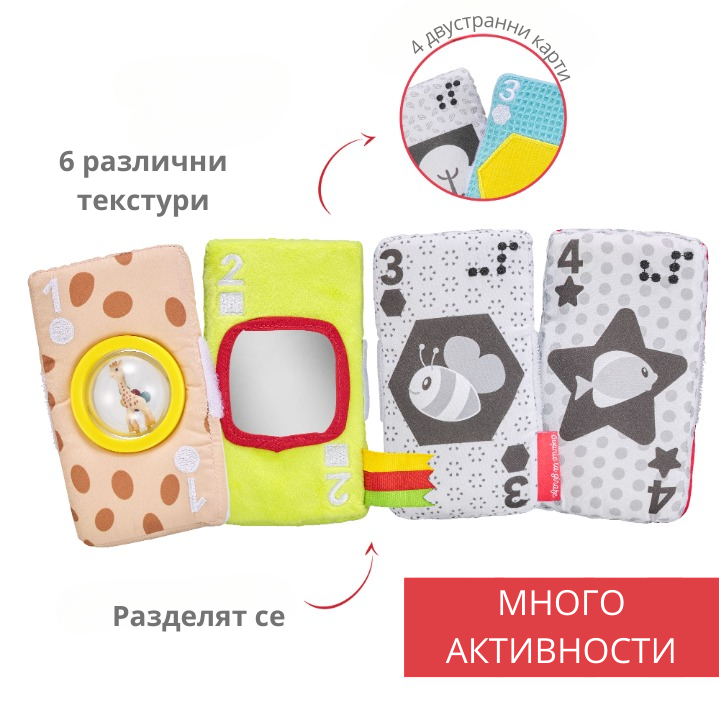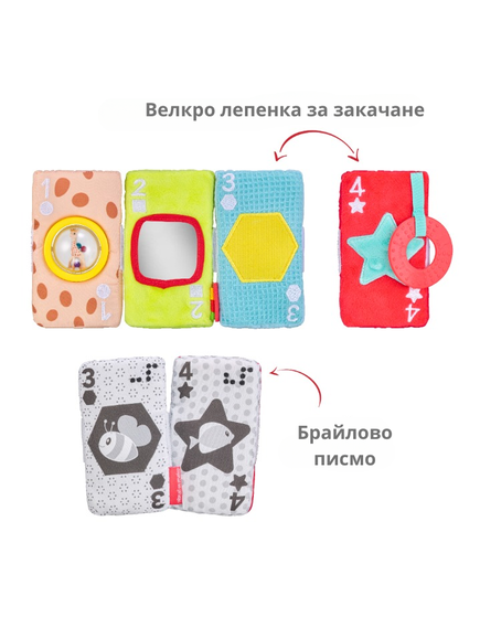 Прекрасна играчка от карти от плат с различни цветове, дизайни и текстури, които ще стимулират всички сетива на бебето!
